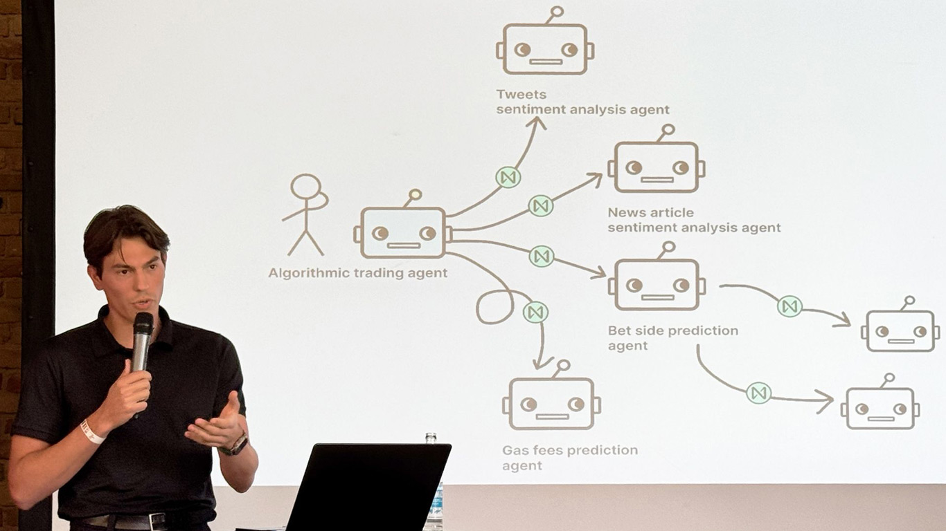 Im dritten Stockwerk befand sich die Mainstage, untergebracht in einem großzügig bestuhlten Vortragssaal mit moderner Medientechnik. Ich nahm in der zweiten Reihe Platz und verfolgte gespannt die Eröffnungs-Keynote von Sebastian Küpers, der uns in das Funktionsprinzip des Masumi Netzwerks einführte. Dabei zeigte er anschaulich, wie KI Agents innerhalb der Cardano Blockchain miteinander interagieren und sich durch diese Architektur effizient verknüpfen lassen, um innerhalb der Masumi Plattform als dynamischer Marktplatz operieren zu können. Besonders aufschlussreich war der anschließende Sneak Preview des Sokosumi Marketplace, der einen ersten praxisnahen Einblick in die künftige Plattform erlaubte. Nach einer kurzen Pause folgte die Keynote von Pierre Le Guen von Near AI, dessen Vortrag mich inhaltlich besonders ansprach. Im Mittelpunkt stand die Frage, wie man KI Agents so konzipieren kann, dass sie unter der aktiven Kontrolle der Nutzerinnen und Nutzer bleiben. In einer zunehmend fragmentierten Anbieterlandschaft verlieren viele Anwender den Überblick, was zu einem Vertrauensdefizit gegenüber autonomen KI-Systemen führt. Der vorgestellte Lösungsansatz von Near AI, der gezielt auf transparente Kontrollmechanismen setzt, stellt einen wichtigen Impuls dar – insbesondere im Hinblick auf die Verantwortung gegenüber Endverbrauchern und regulatorische Anforderungen.